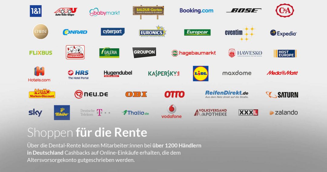 Im Rahmen der DentalRente haben Sie die Option, Ihren Mitarbeitern bei namhaften Einzelhändlern fast aller Branchen Cashbacks auf online-Einkäufe zu generieren. Die Cashback werden dem persönlichen Altersvorsorgekonto gutgeschrieben und verzinsen sich dort.