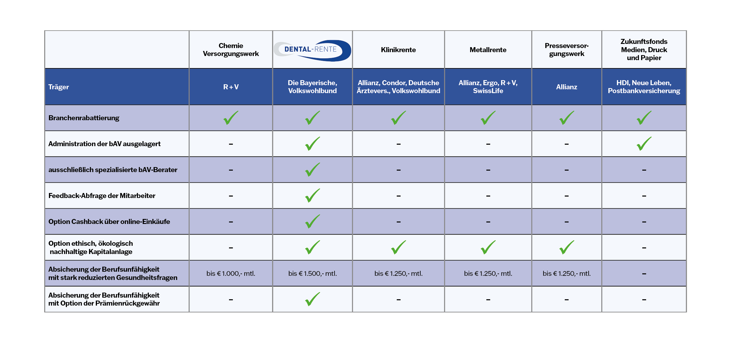 Die Berater übernehmen ebenfalls kostenfrei die gesamte vorgeschriebene Dokumentation der Beratungen, die Prüfung bereits bestehender bAV-Verträge auf Leistungsrisiken sowie (eventuell gegen Honorierung) die Überprüfung bestehender Pensionszusagen im Hinblick auf notwendige oder gewünschte Auslagerung (BILMOG).